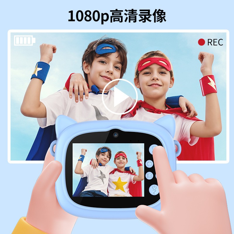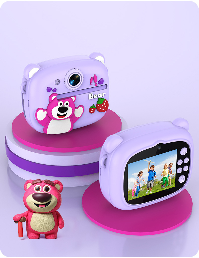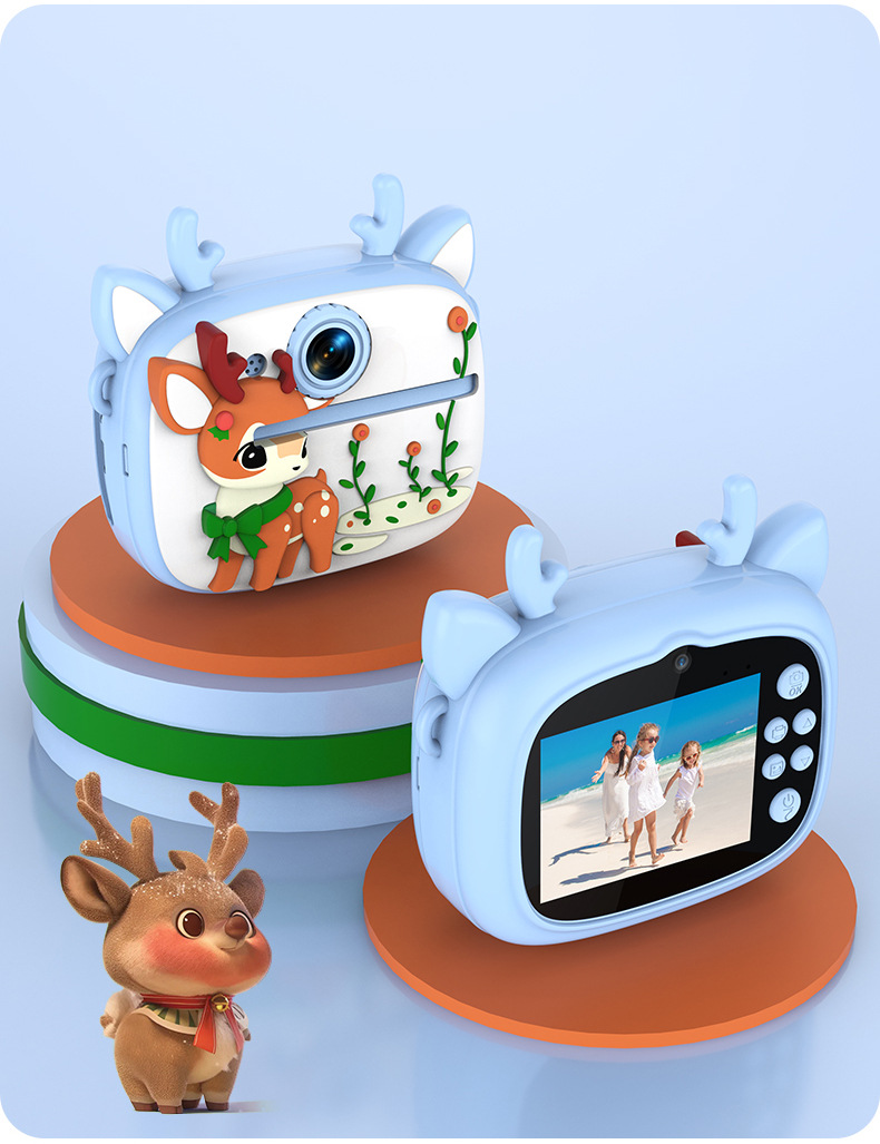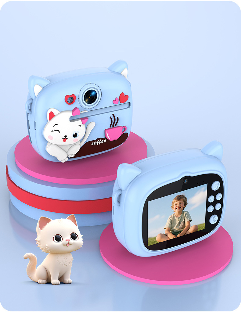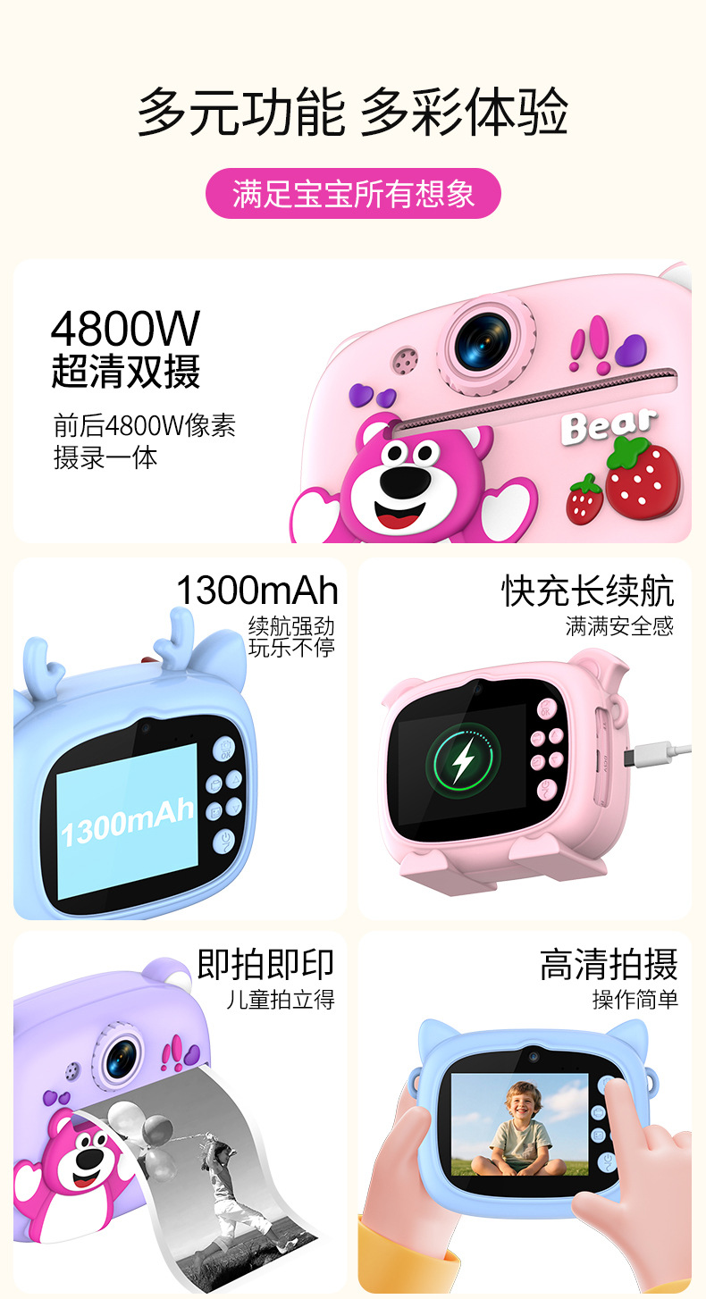 New model children's instant camera can take photos. It comes with a silicone protective cover and can print high-definition pictures. It has dual cameras for taking frontal and rear shots and is capable of recording videos. It is a children's camera YS2