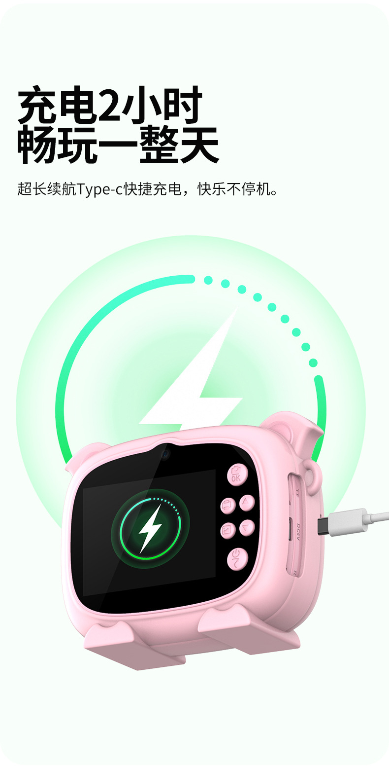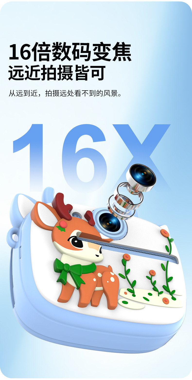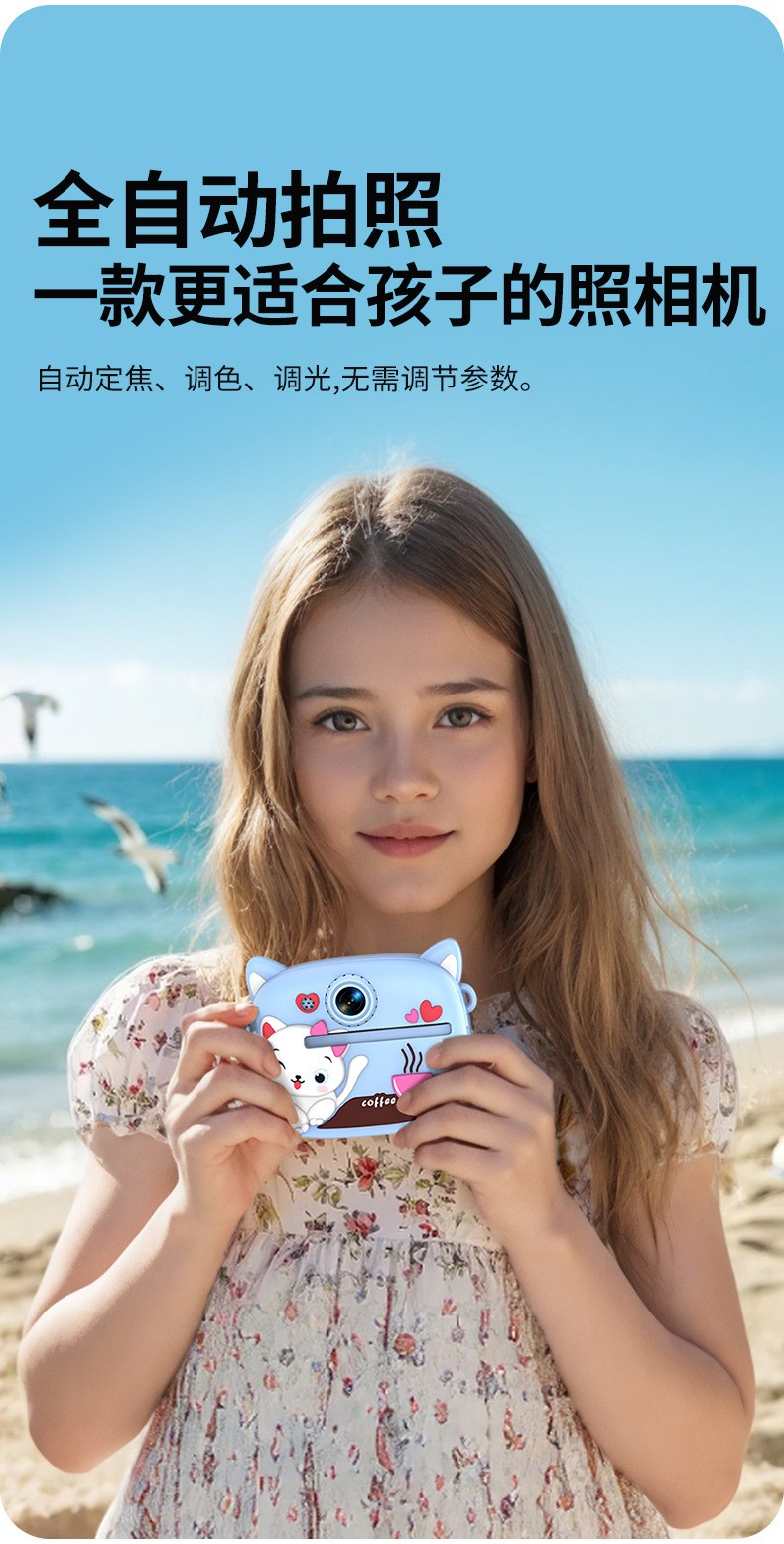 New model children's instant camera can take photos. It comes with a silicone protective cover and can print high-definition pictures. It has dual cameras for taking frontal and rear shots and is capable of recording videos. It is a children's camera YS2