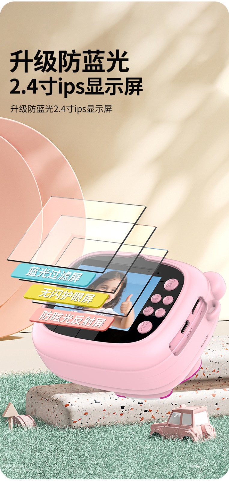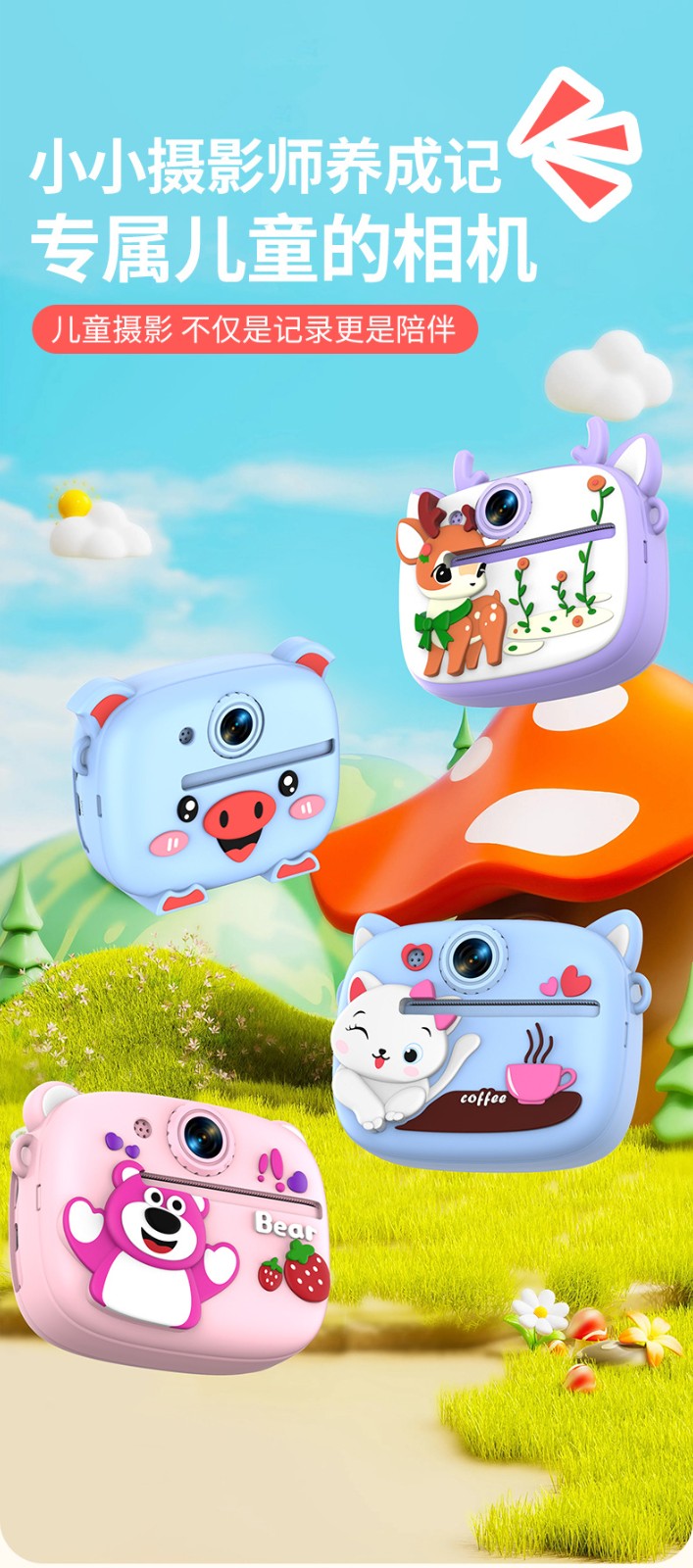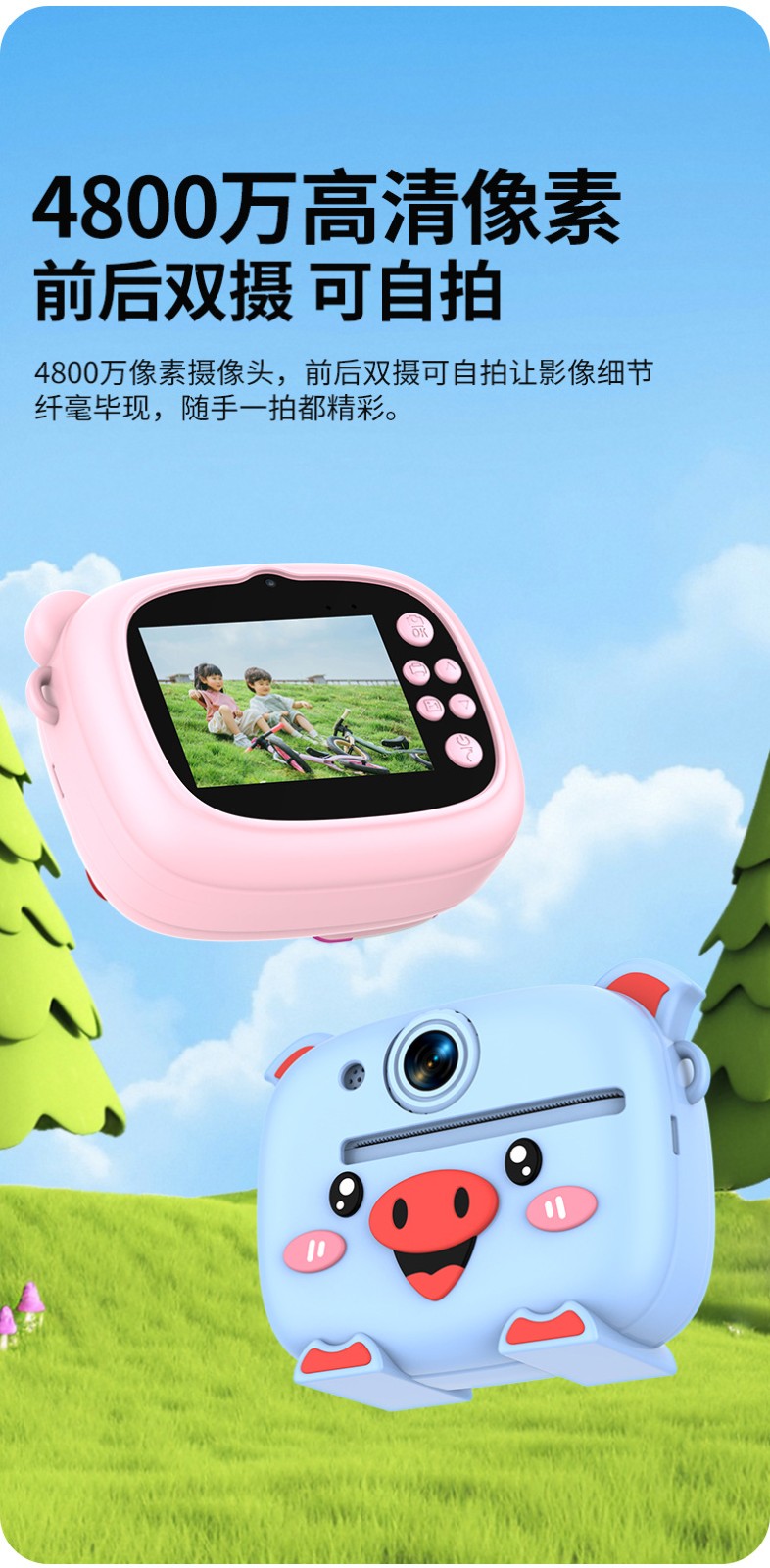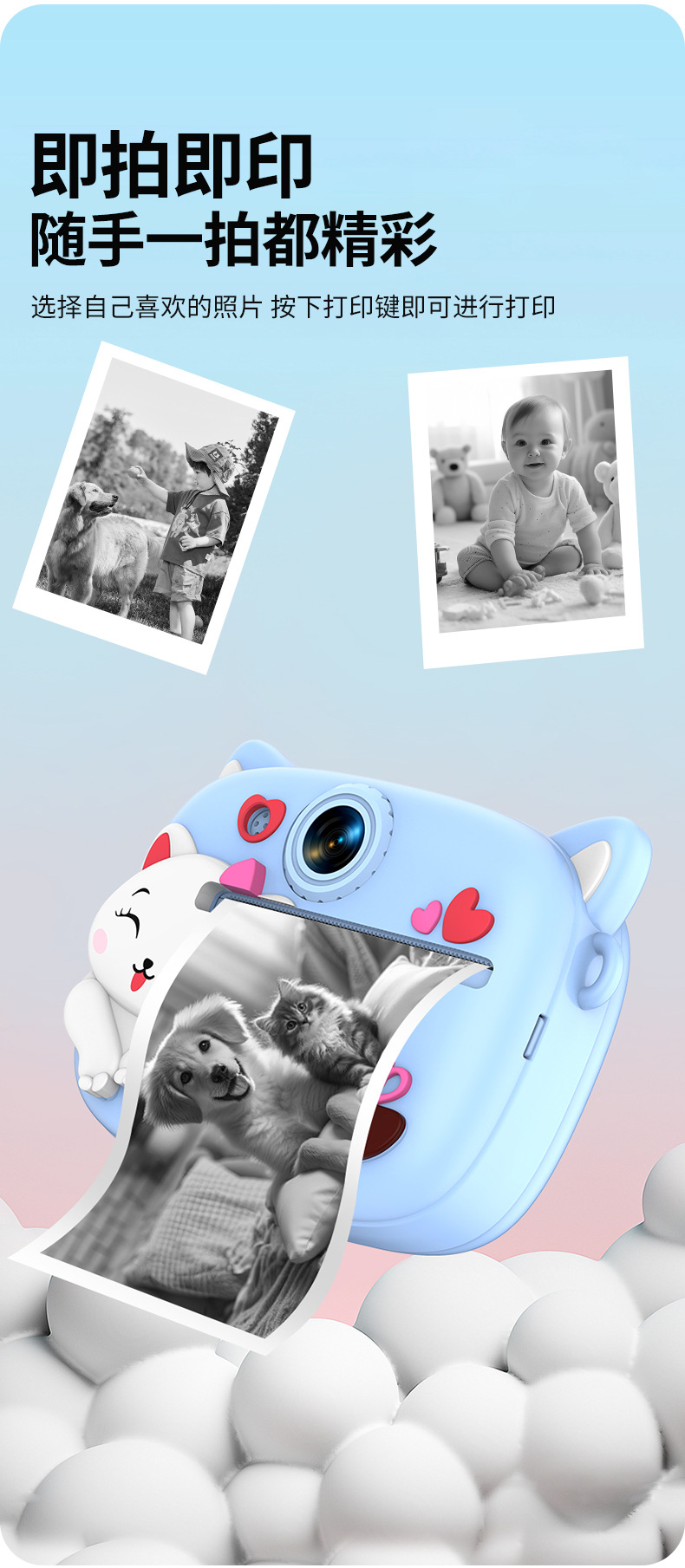 New model children's instant camera can take photos. It comes with a silicone protective cover and can print high-definition pictures. It has dual cameras for taking frontal and rear shots and is capable of recording videos. It is a children's camera YS2