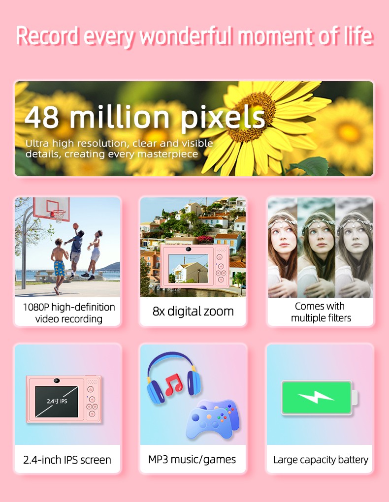 twin lens,VGA30W,2.4Inches,IPS,5 types of filters, 10 types of special effects, 9 photo frames, 12 types of collage frames, 9 video frames.