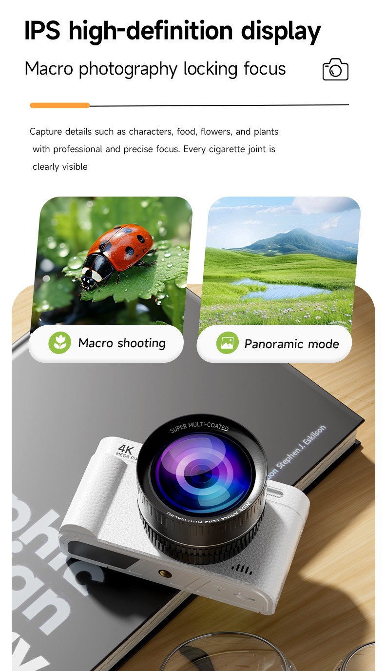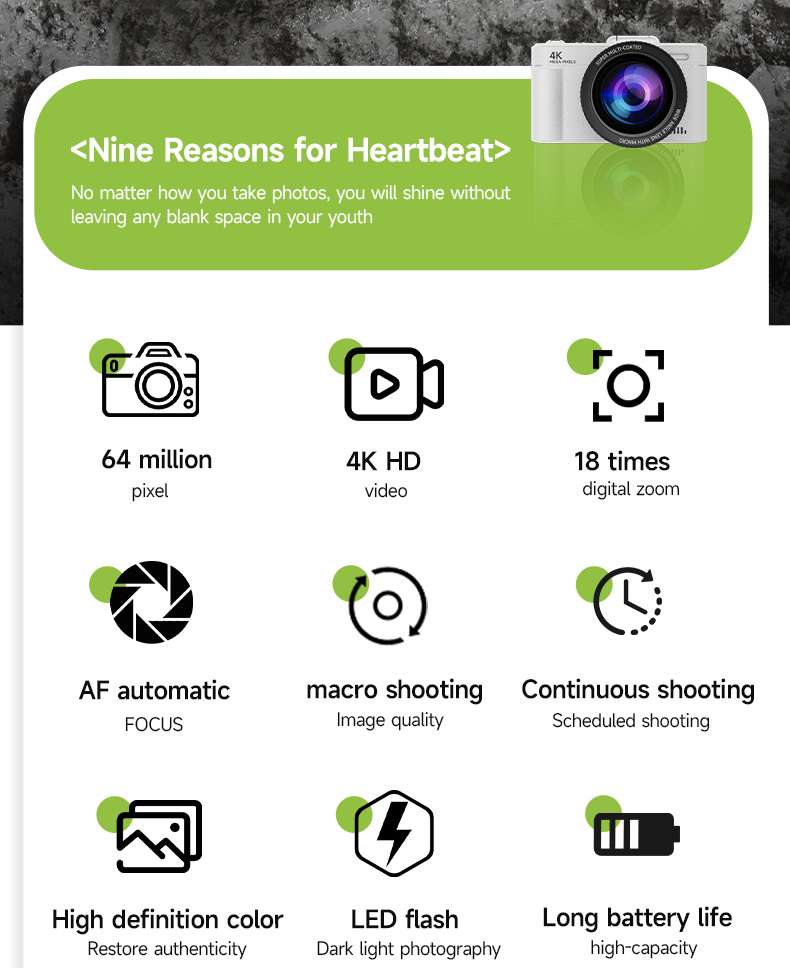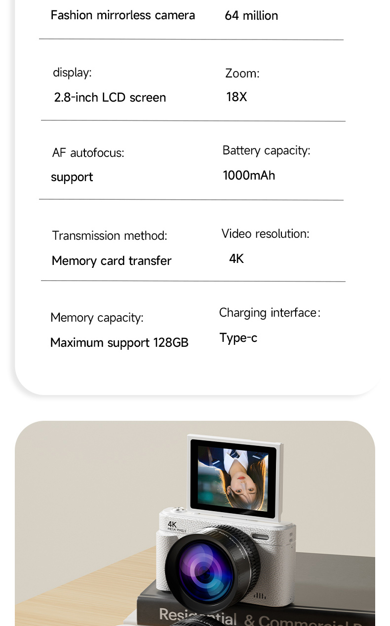 Standard video recording, loop recording, AF automatic focusing, 180-degree flip screen, 120 million pixels, 2.8-inch TFT color display (640*480), standard photography, timed photography, continuous photography