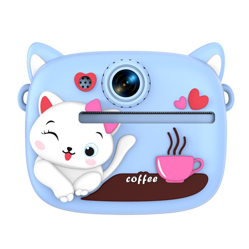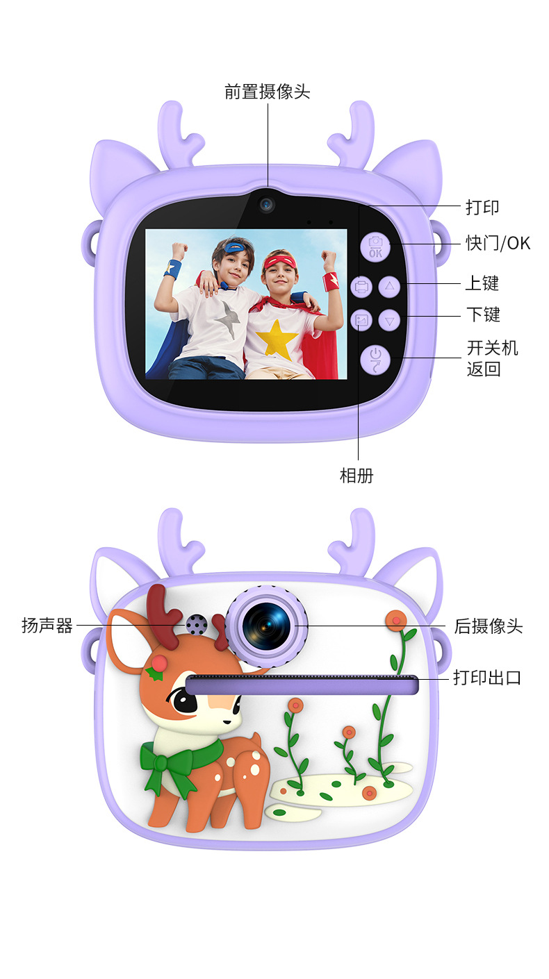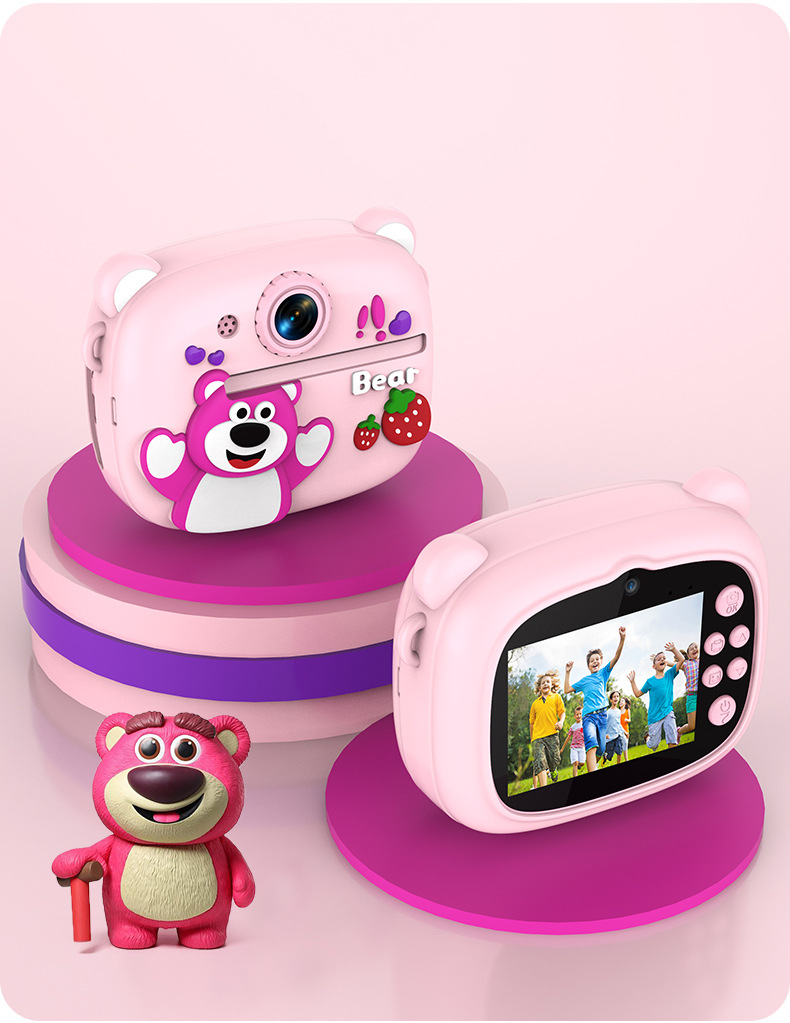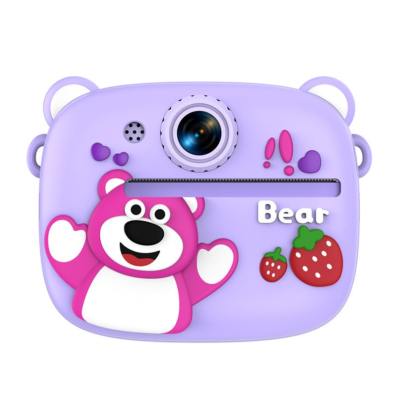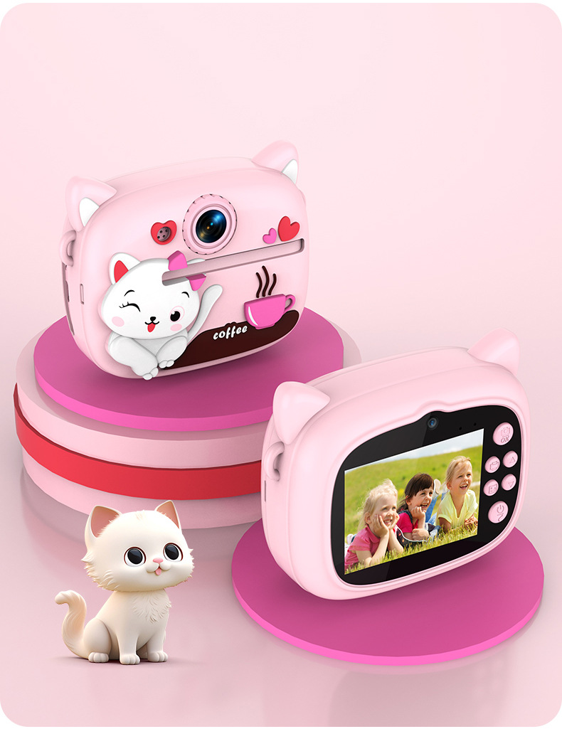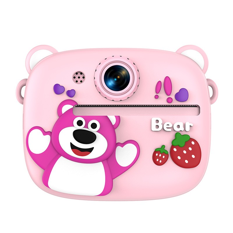 New model children's instant camera can take photos. It comes with a silicone protective cover and can print high-definition pictures. It has dual cameras for taking frontal and rear shots and is capable of recording videos. It is a children's camera YS2