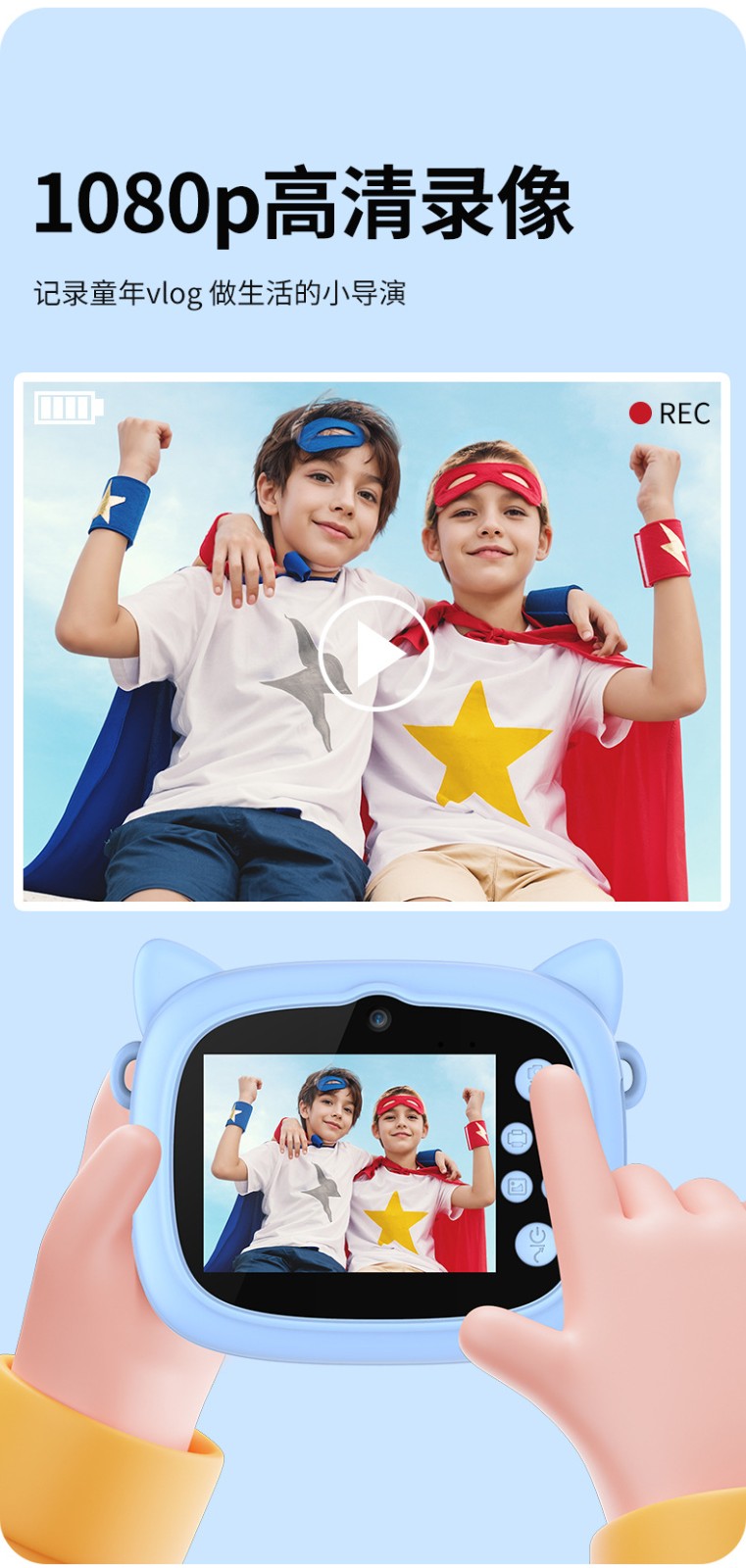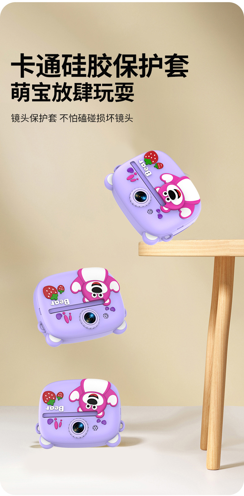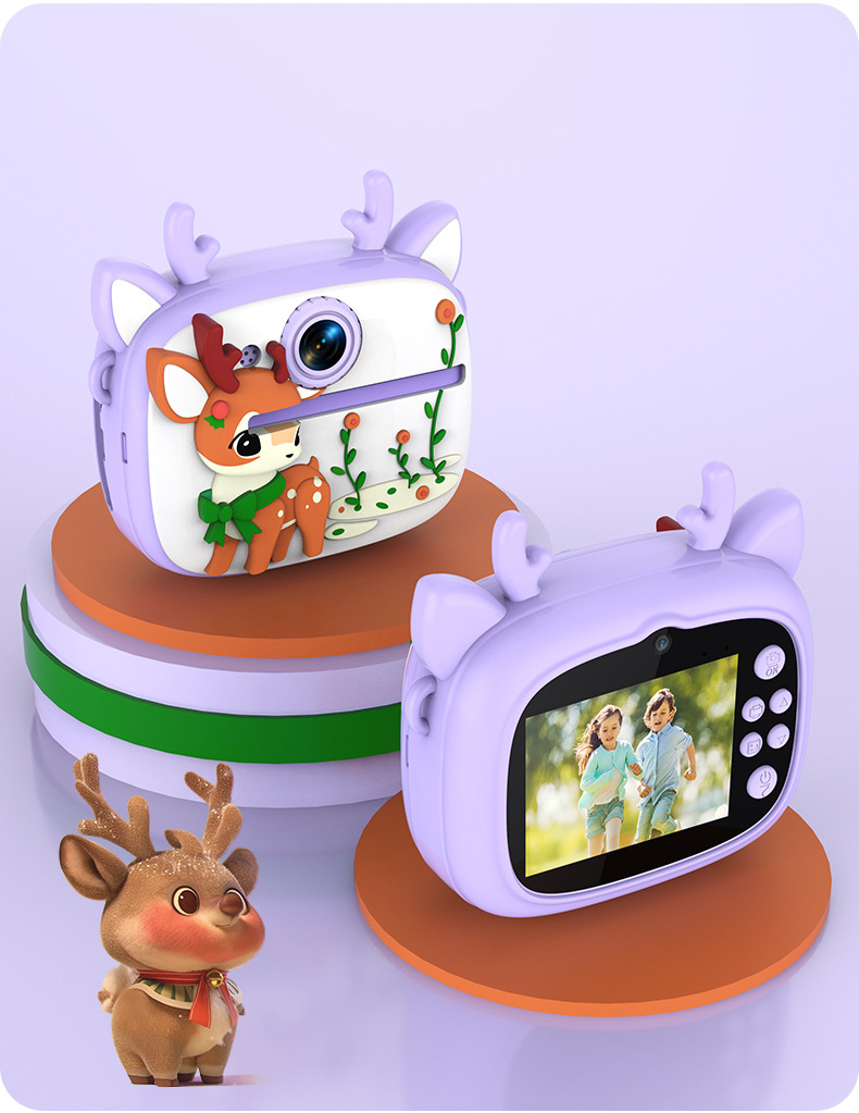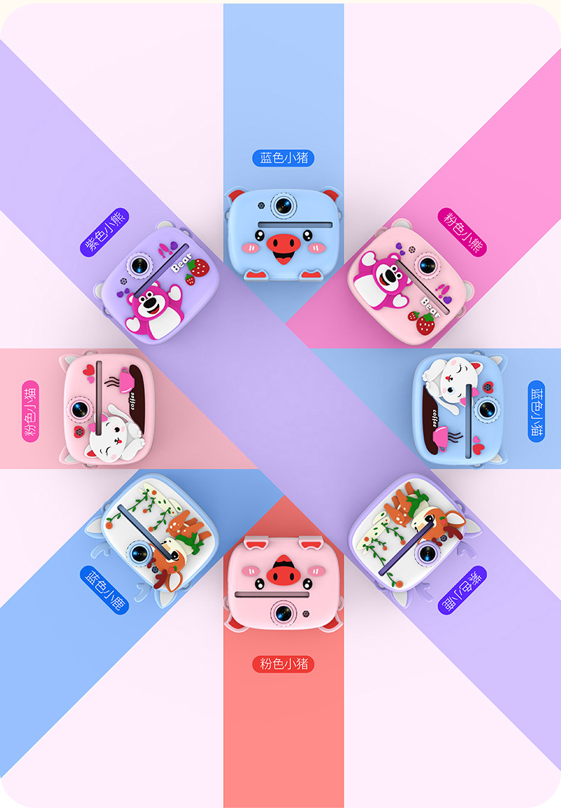 New model children's instant camera can take photos. It comes with a silicone protective cover and can print high-definition pictures. It has dual cameras for taking frontal and rear shots and is capable of recording videos. It is a children's camera YS2